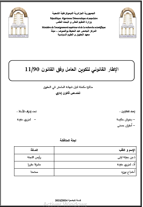 بخوش، حكيمة et al. (2025). الإطار القانوني لتكوين الموظف وفقا للقانون 90-11 (ماستر- ل م د) . المركز الجامعي عبد الحفيظ بوالصوف ميلة.