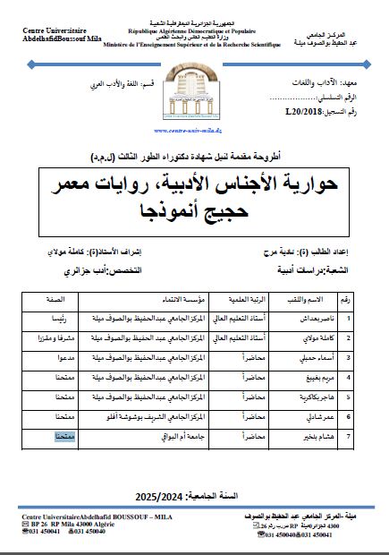 مرج نادية & ناصر بعداش(رئيسا)،كاملة مولاي( مشرفا و مقرّرا)،أسماء حمبلي(مدعوا)،مريم بغيبغ(ممتحنا)،هاجر بكاكرية(ممتحنا)،عمر شادلي(ممتحنا)،هشام بلخير(ممتحنا) (2025). حوارية الأجناس الأدبية، روايات معمر حجيج أنموذجا (دكتوراه) . المركز الجامعي عبد الحفيظ بوالصوف.