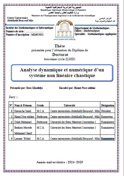 Daas Khadidja & Kaouache Smail(Président), H. (2025). Analyse dynamique et numérique d’un système non linéaire chaotique (Doctotrat) . Centre universitaire Abdelhafid Boussouf Mila.